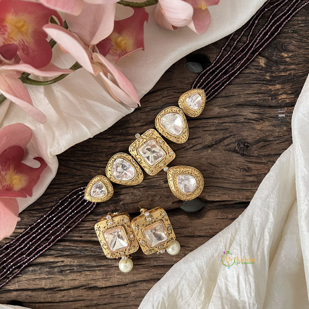 Elevate your style with our Premium Multilayer Victorian Diamond Choker. The white Victorian diamond design and brown beads add a touch of elegance to any outfit. Perfect for special occasions or everyday wear. Show off your unique style with this eye-catching choker. Comes with matching earrings.