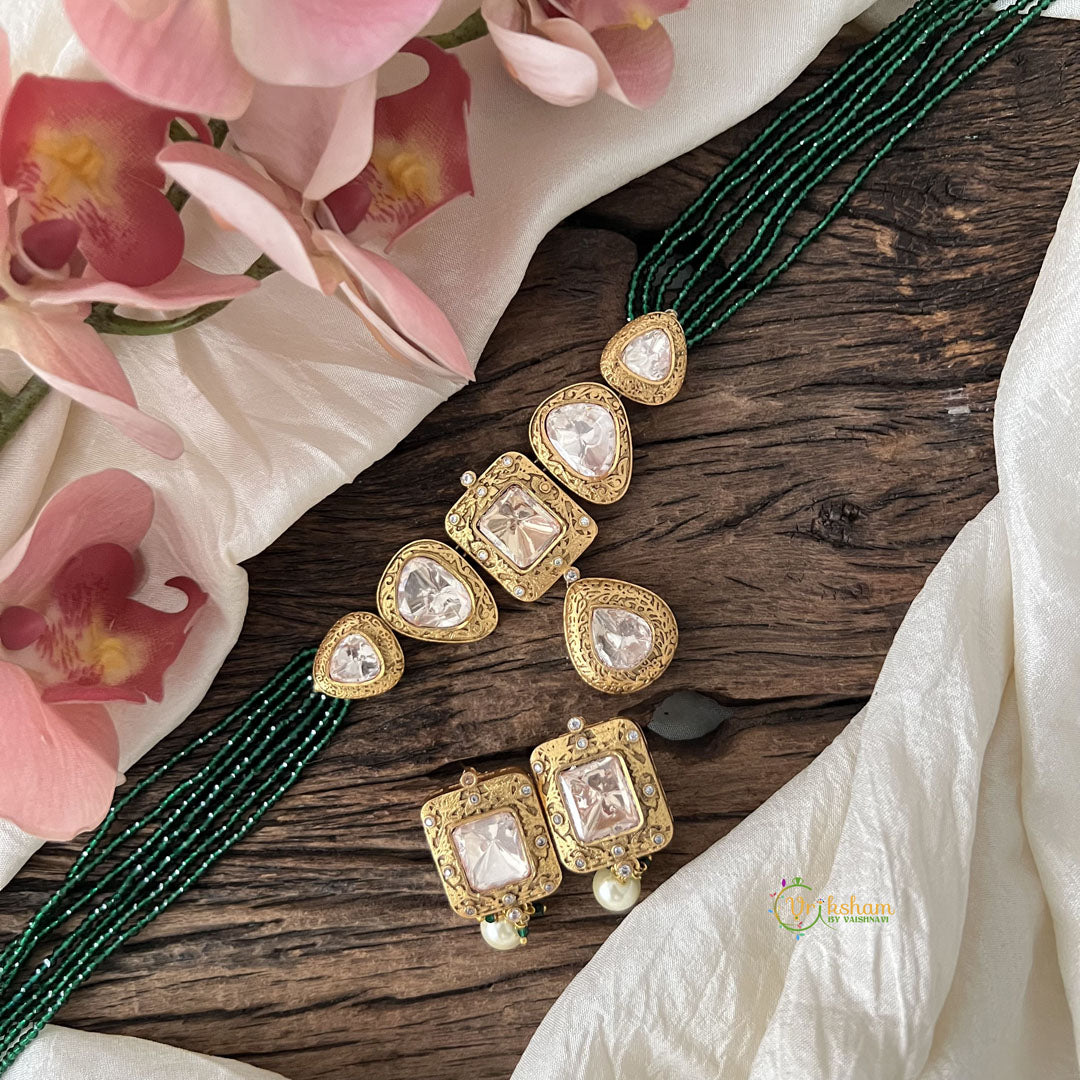 Elevate your style with our Premium Multilayer Victorian Diamond Choker. The white Victorian diamond design and green beads add a touch of elegance to any outfit. Perfect for special occasions or everyday wear. Show off your unique style with this eye-catching choker. Comes with matching earrings.