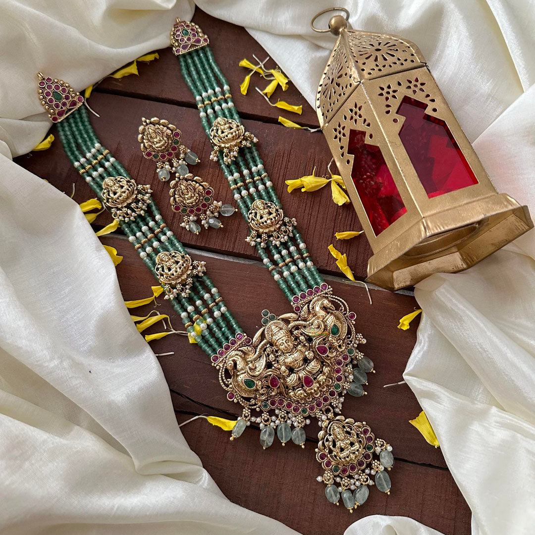 Indulge in luxury with our Premium Multilayered Lakshmi Pendant Haram-Green Bead. This stunning piece features a beautifully crafted Lakshmi pendant and multiple layers of beads in a rich green hue. Elevate any outfit with this exclusive and sophisticated necklace.