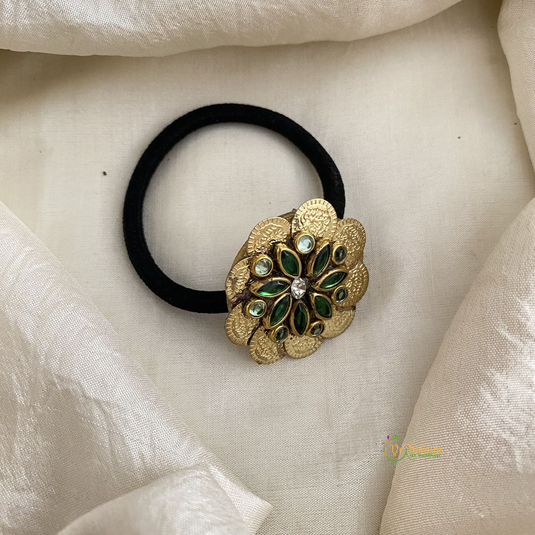 Premium Olive & Dark Green Floral Kundan Pendant Rubber Band - semi precious stone - Festive Wear Hair bands-premium gold like polish pendant.