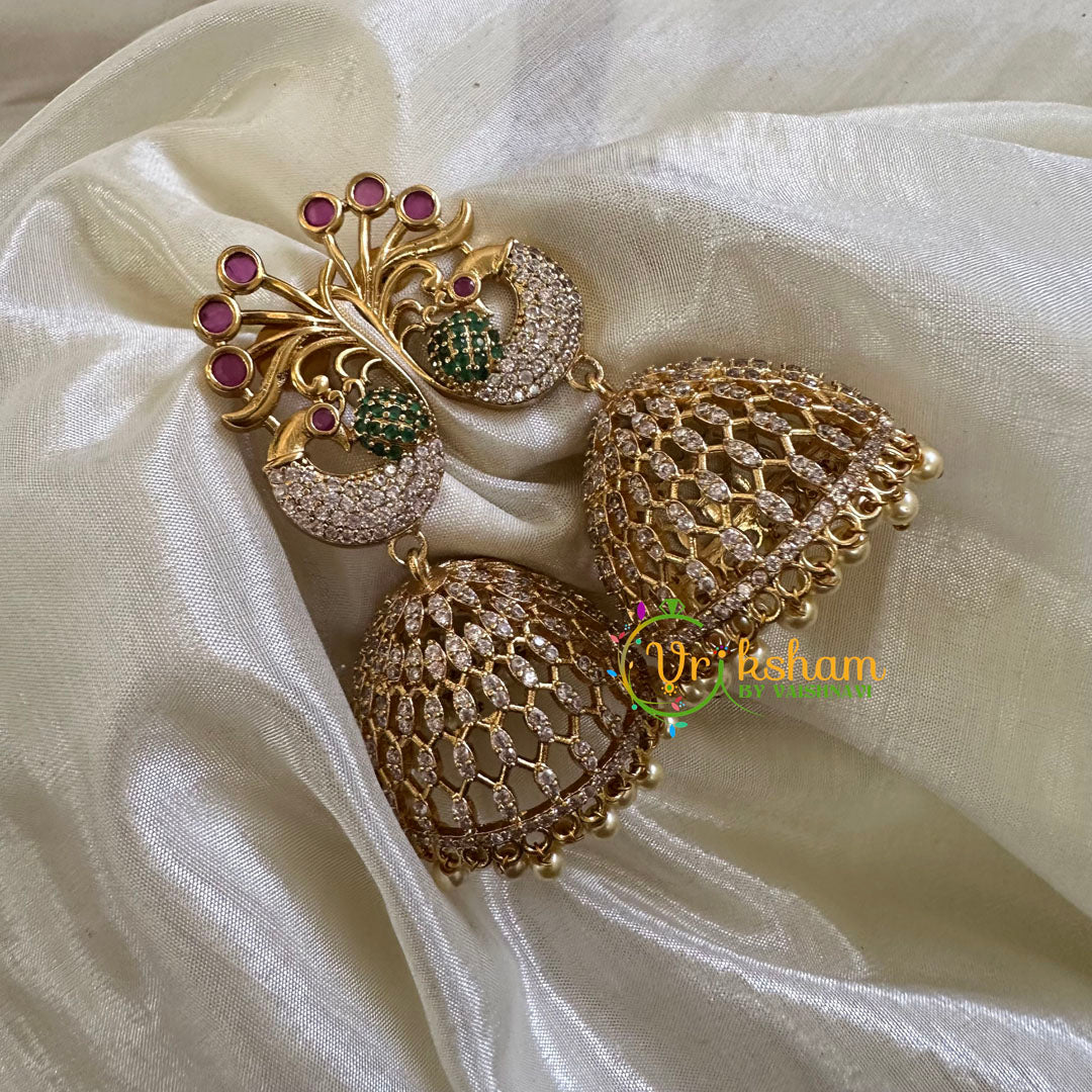 Premium Peacock AD Stone Jhumkas -Green Red regular stone studded stud base jhumkas ; premium matt finish earrings.