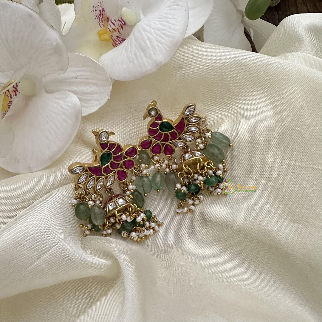 Indulge in pure luxury with our Premium Peacock Jadau Kundan Earrings. The intricate design features a stunning jhumka and exquisite Kundan work, exuding elegance and sophistication. Elevate any outfit and make a statement with these exclusive and unique earrings.