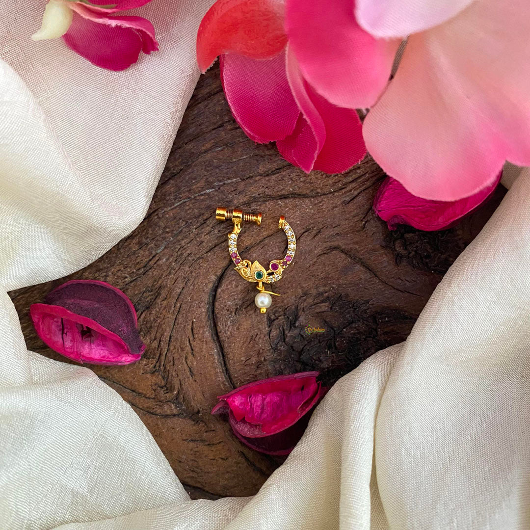 Premium Peacock Red Green AD Stone Nath / Nose pin-Pearl-G13998