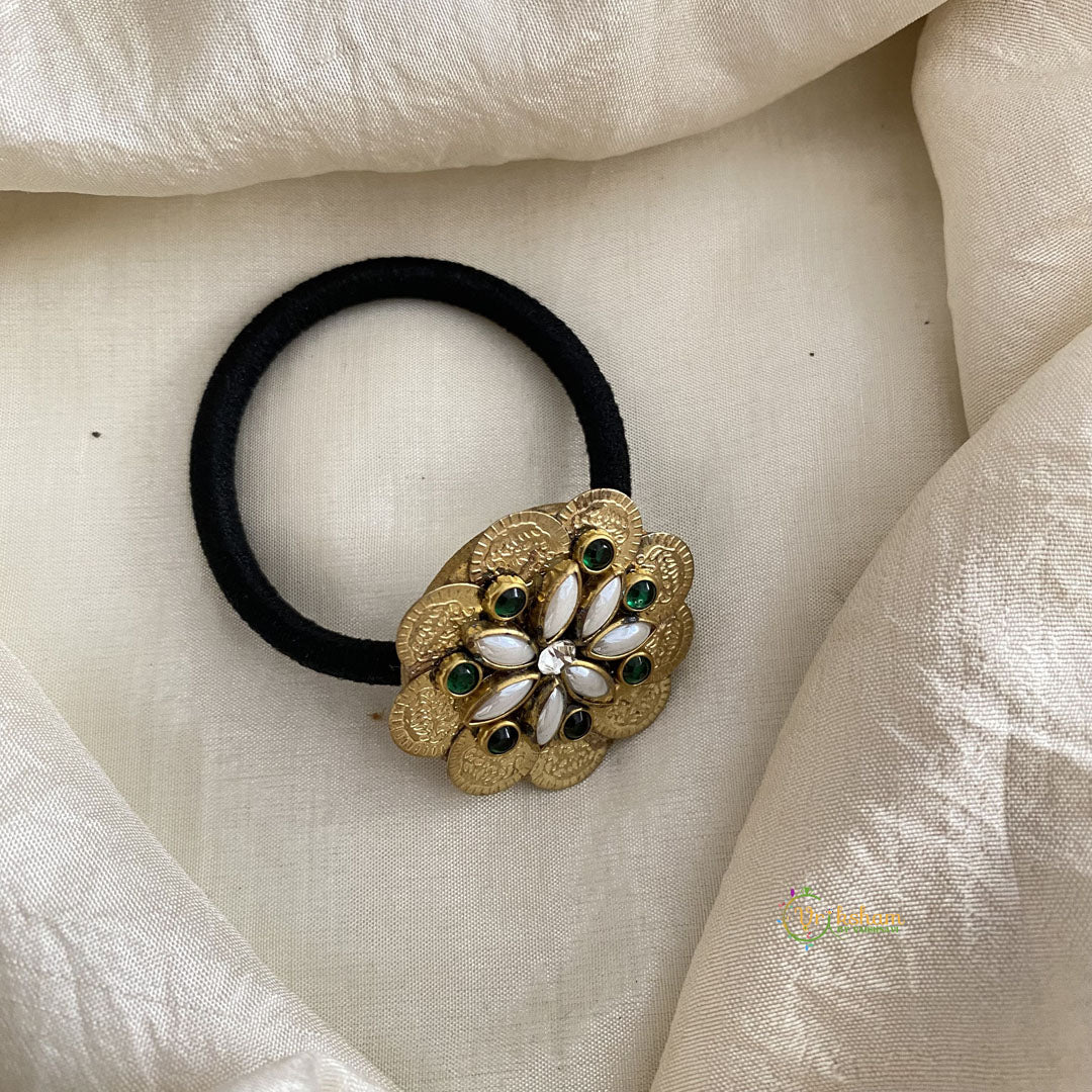 Premium Pearl White Green Floral Kundan Pendant Rubber Band - semi precious stone - Festive Wear Hair bands-premium gold like polish pendant.