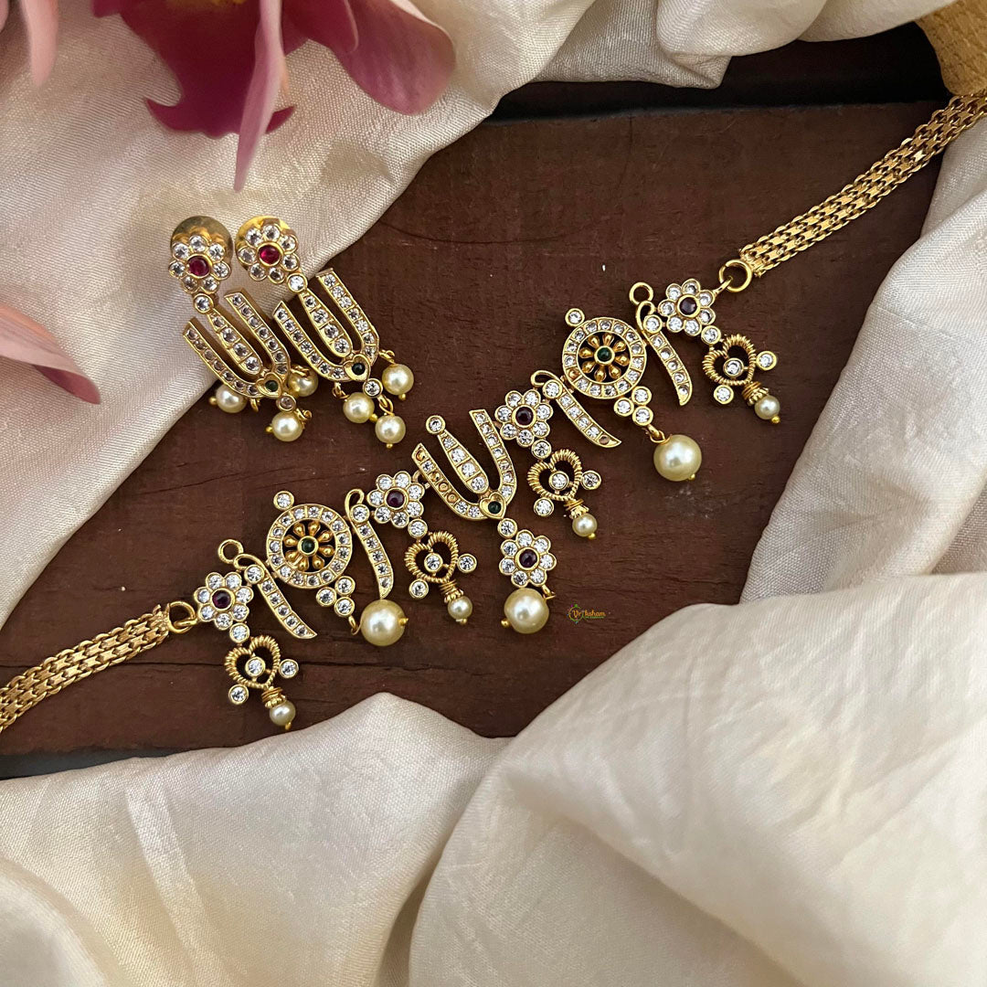 Elevate your style with our exquisite Premium Perumal Thiruman and Shank Chakra Choker. Made of high-quality materials, it comes with matching earrings for a complete look. Bring divine energy and elegance to any outfit with this beautiful set.