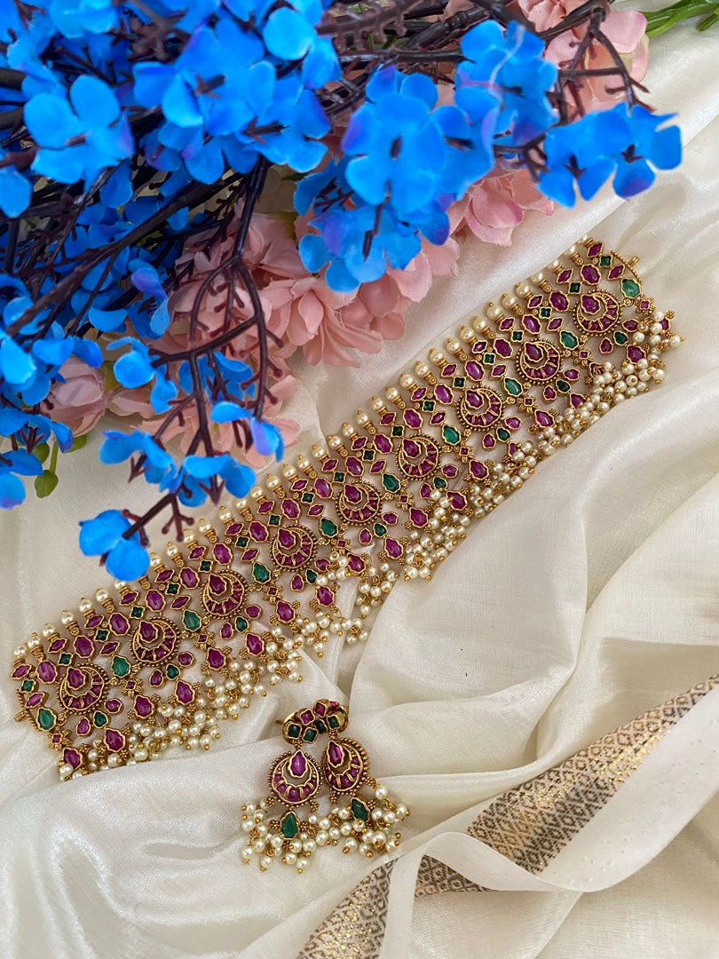 Premium Precious Kemp High Neck Choker with upper layer pearl studded throughout; comes with matching ear hangings. Cluster Pearl Finish.