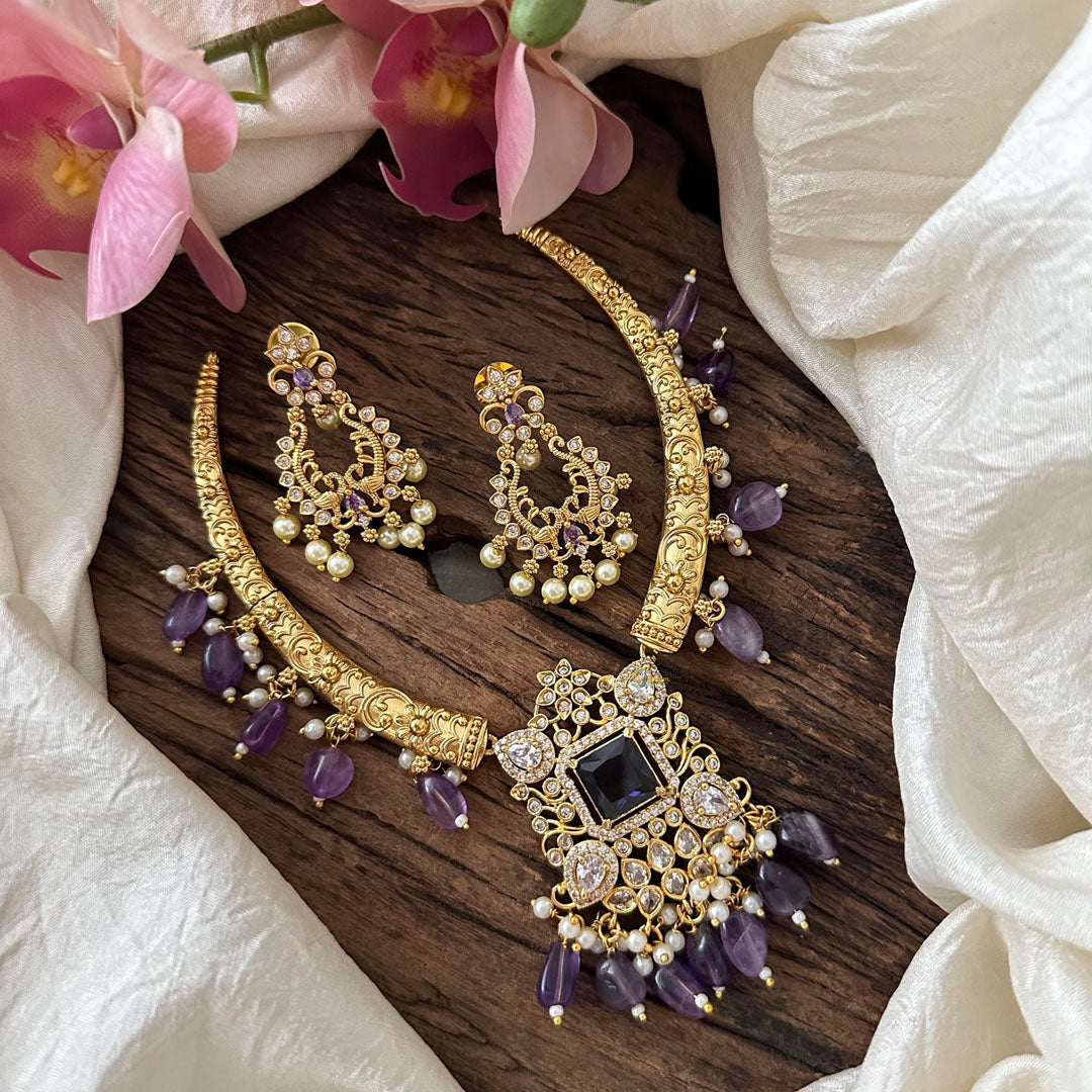 Elevate your style with our Premium Purple AD Stone Hasli Neckpiece-Beads- The stunning purple stones and intricate beadwork add a touch of elegance to any outfit. Upgrade your jewelry collection and make a statement with this unique neckpiece. Perfect for any occasion. Comes with matching earrings.