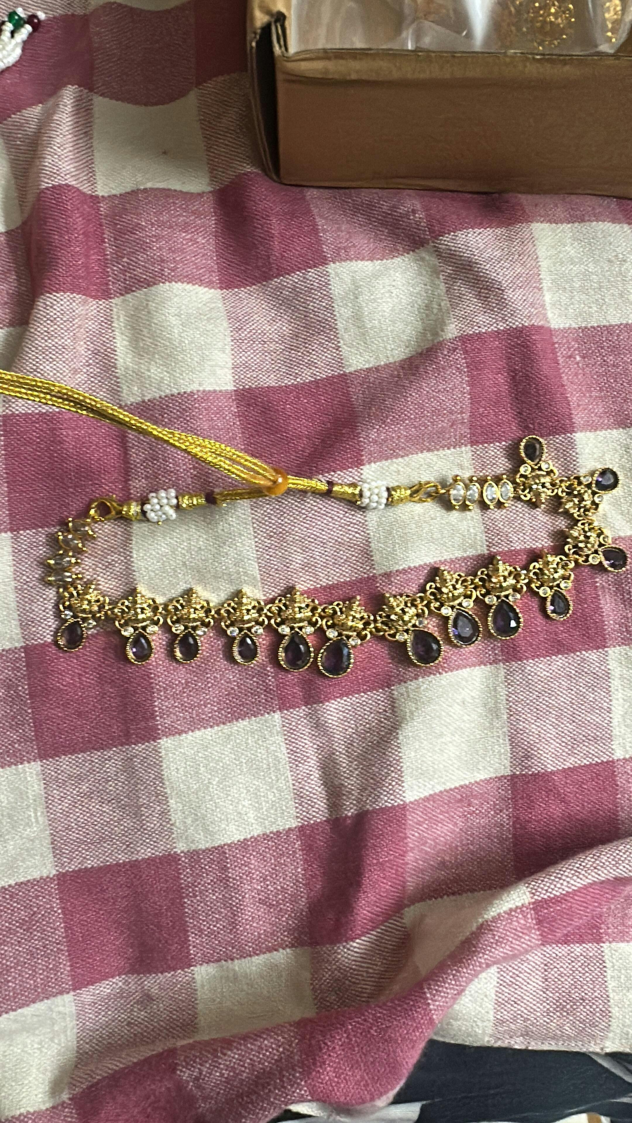 Indulge in luxury with our Premium Purple AD Stone Lakshmi Neckpiece-Tear Drop. The intricately designed neckpiece features sparkling purple AD stones and a beautiful Lakshmi figurine, symbolizing wealth and beauty....
