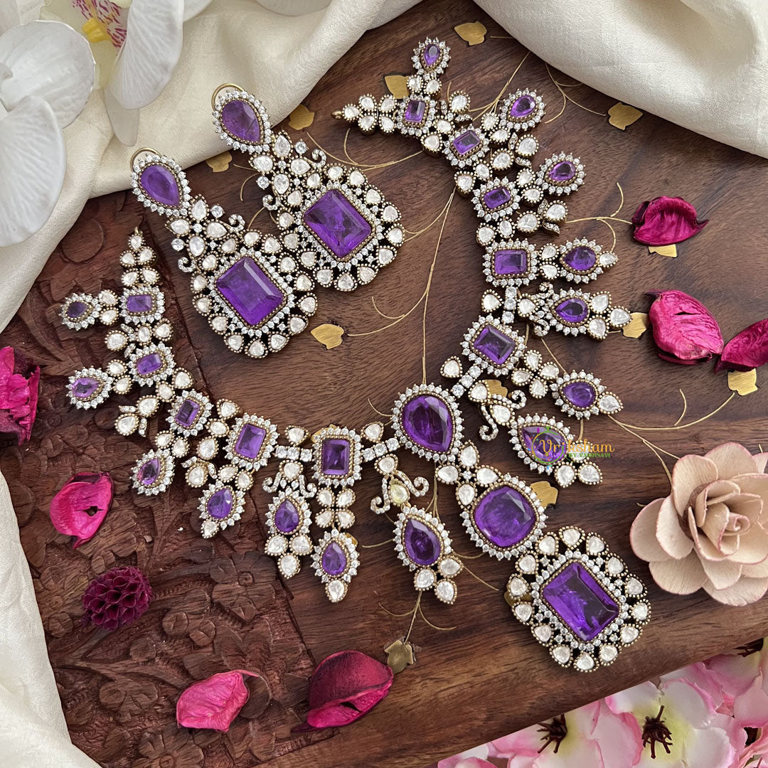 Premium Purple Victorian Diamond Short Pendant Neckpiece -The Victorian diamond pendant necklace is a mesmerizing embodiment of the era's romance and elegance. Featuring a stunning diamond centerpiece, delicately framed by intricate filigree work and ornate detailing, this necklace exudes opulence and refinement ;comes with matching earrings.