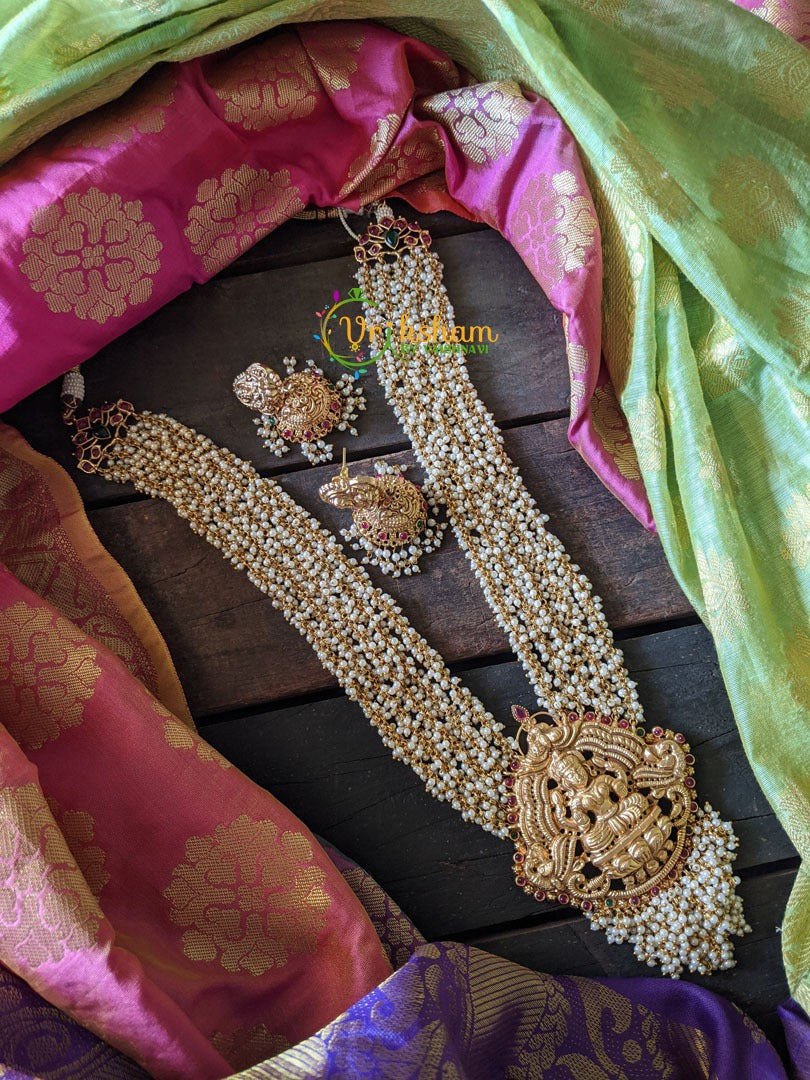 Premium Quality Heavy Krishna Pearl Haaram - This is a very beutiful designed pendant with much intricately designed threads on both the sides, which has full pearl embalishments which is a gold look alike neckpiece and comes with earrings.
