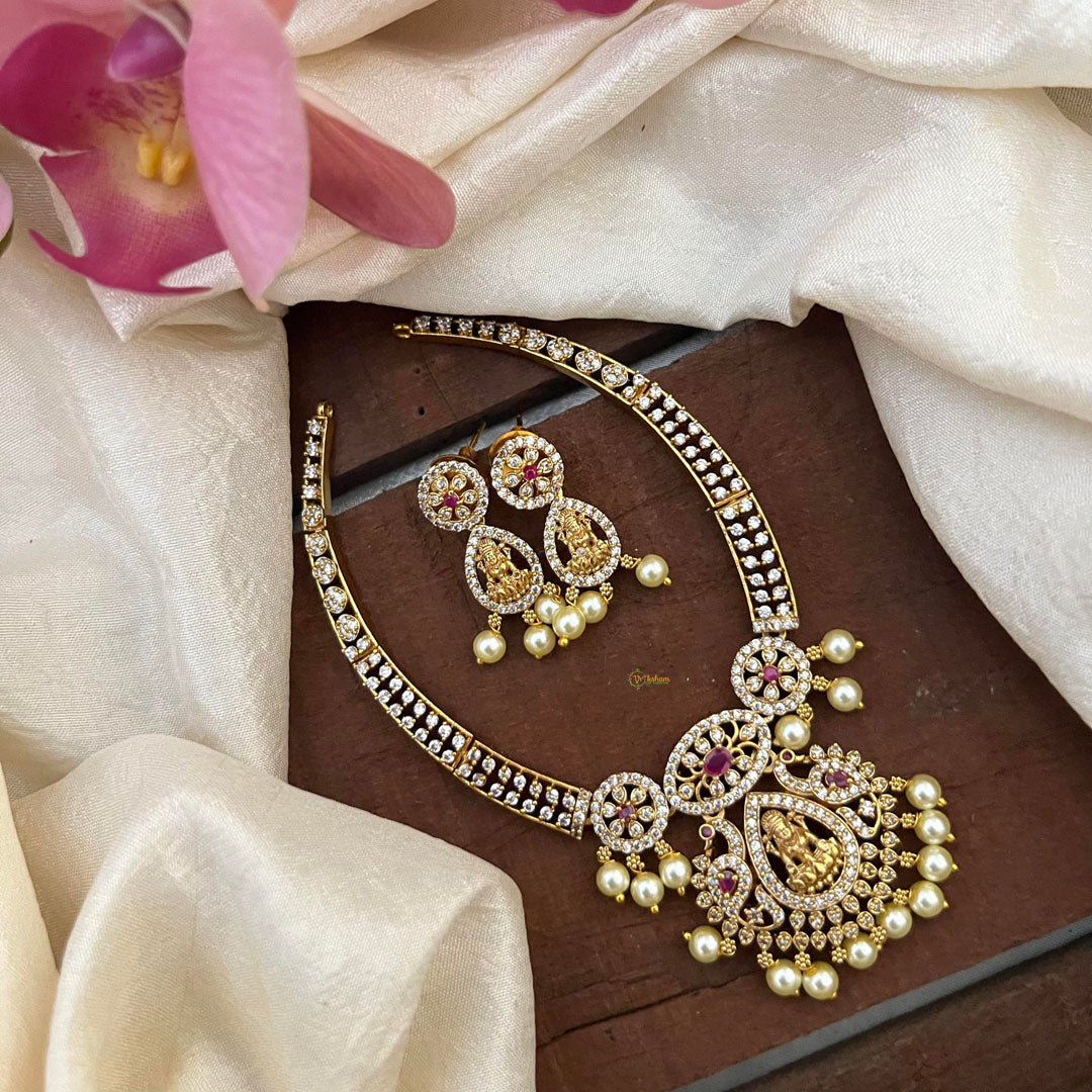 Elevate your style with our Premium AD Stone Lakshmi Hasli-Temple Neckpiece! Made with high-quality AD stones and adorned with pearls, this piece exudes elegance and sophistication. Complete your look with the matching earrings included with the neckpiece. A must-have for any fashion enthusiast!