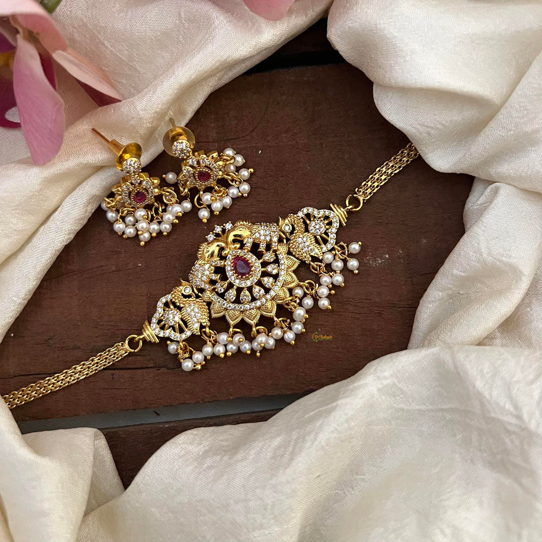Elevate your look with our Premium AD Stone Mayil Elephant Choker and matching earrings. This stunning set features intricate detailing and dazzling red stones, sure to catch everyone's attention. Add a touch of elegance to any outfit and make a statement with this beautiful choker and earrings set.