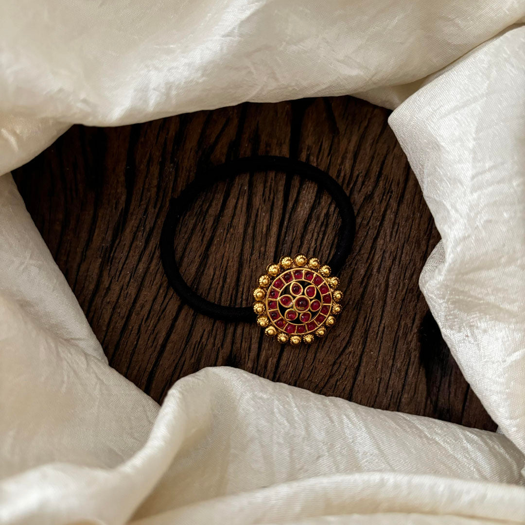 Experience elegance with our Premium Red Flower Festive Rubber Band. Adorned with precious red stones, this premium gold look-alike floral band is the perfect accessory for any festive occasion. Add a touch of sophistication to your look and stand out in the crowd.