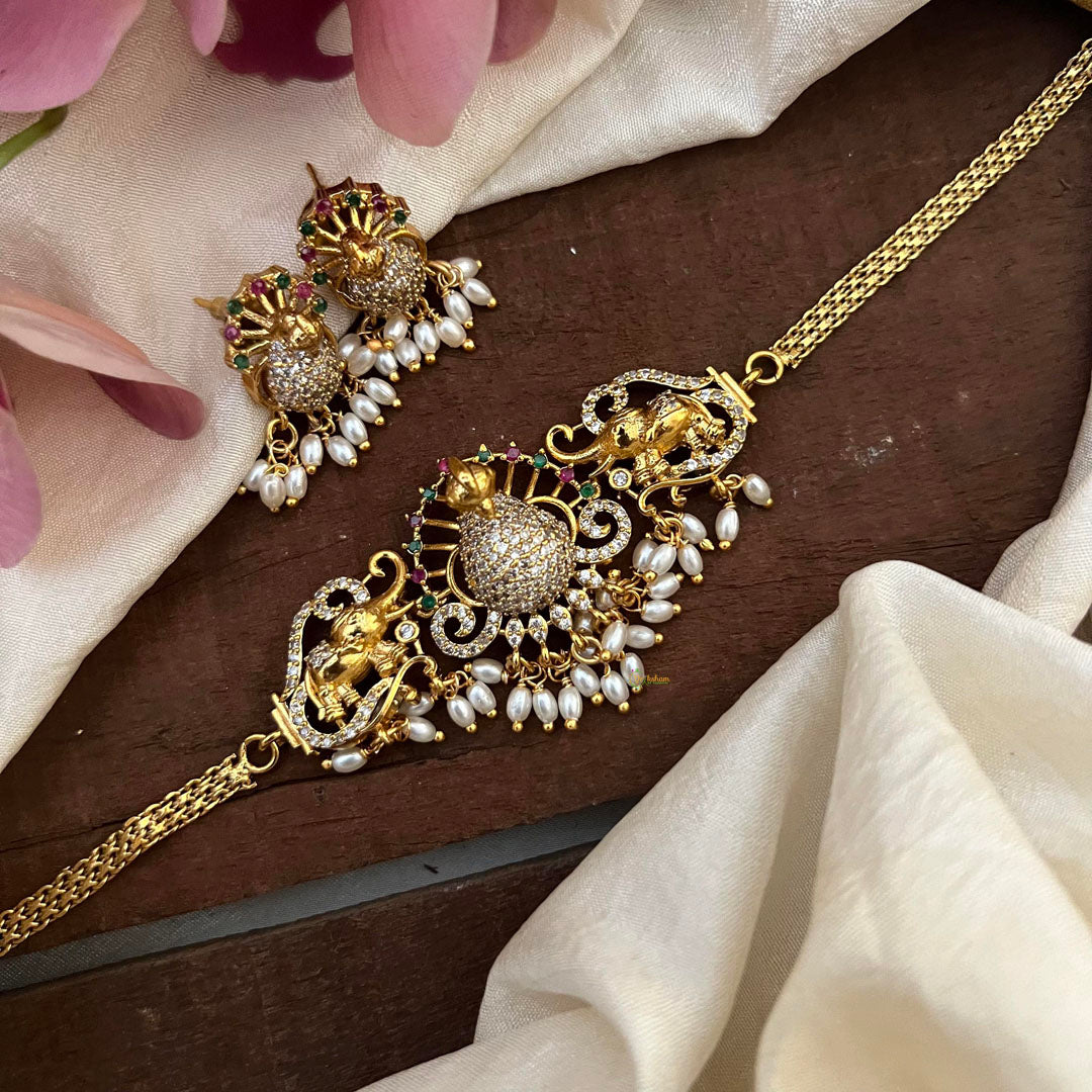Be the center of attention with our Premium Red Green AD Stone Peacock Choker-Rice Pearl! The intricate design and vibrant colors of this choker will make you stand out in any crowd. And with a pair of matching earrings included, you'll have a complete and stunning look. Elevate your style game today!