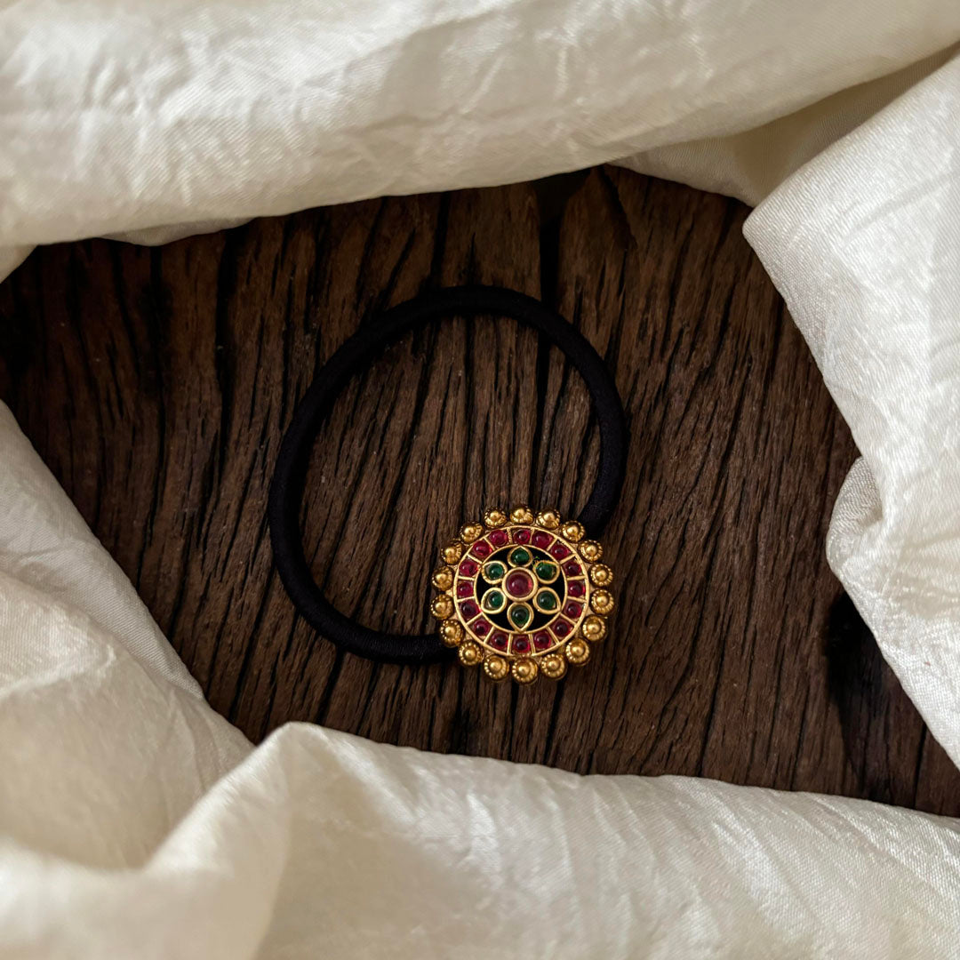 Experience elegance with our Premium Red Green Flower Festive Rubber Band. Adorned with precious red and green stones, this premium gold look-alike floral band is the perfect accessory for any festive occasion. Add a touch of sophistication to your look and stand out in the crowd.