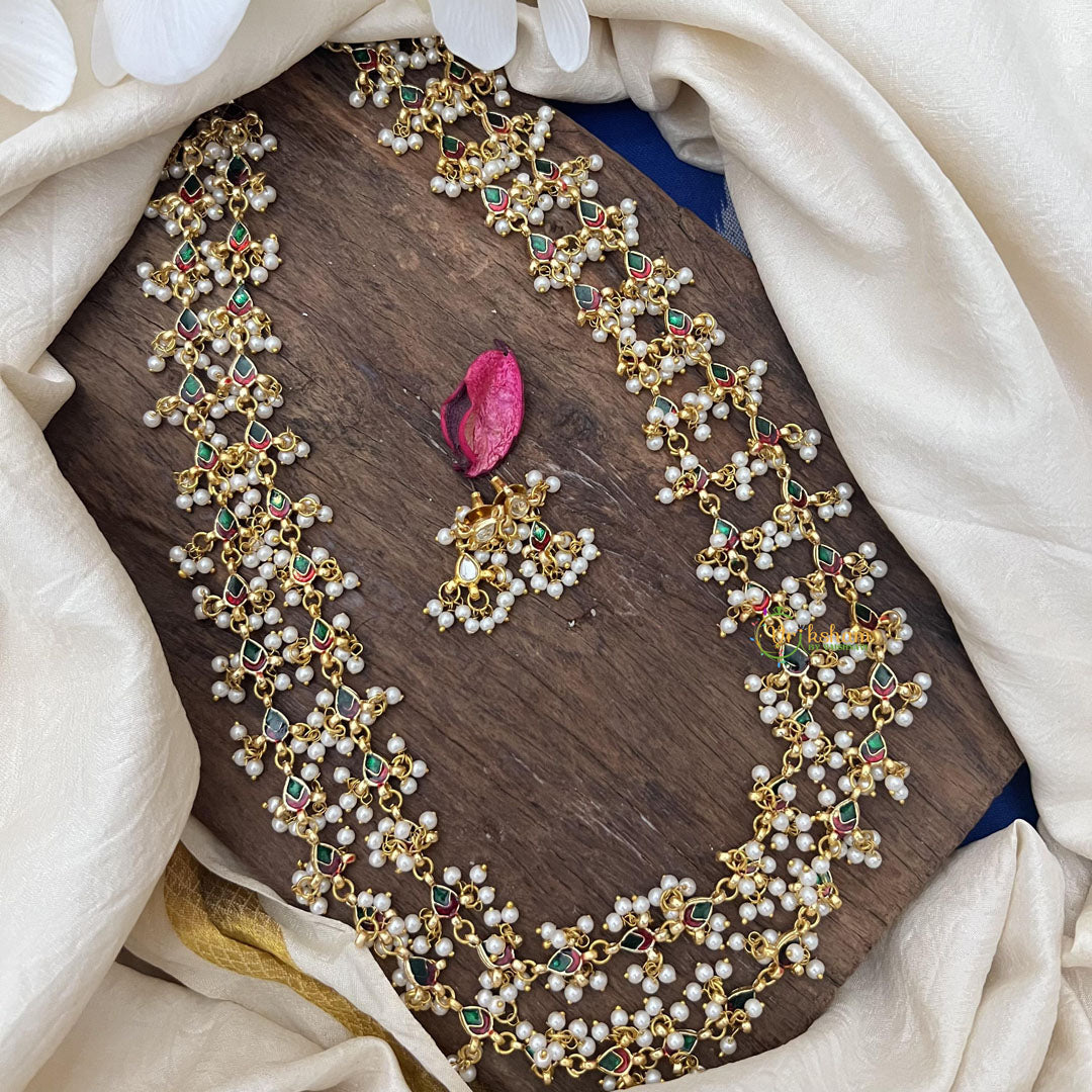 Indulge in a luxurious and exclusive piece from our collection with the Premium Reversible Layered Kundan Stone Haram-Pearl. This handcrafted masterpiece boasts intricate Kundan stones and can be worn in two stunning ways. Complete the look with the matching earrings for a truly elevated and elegant style.