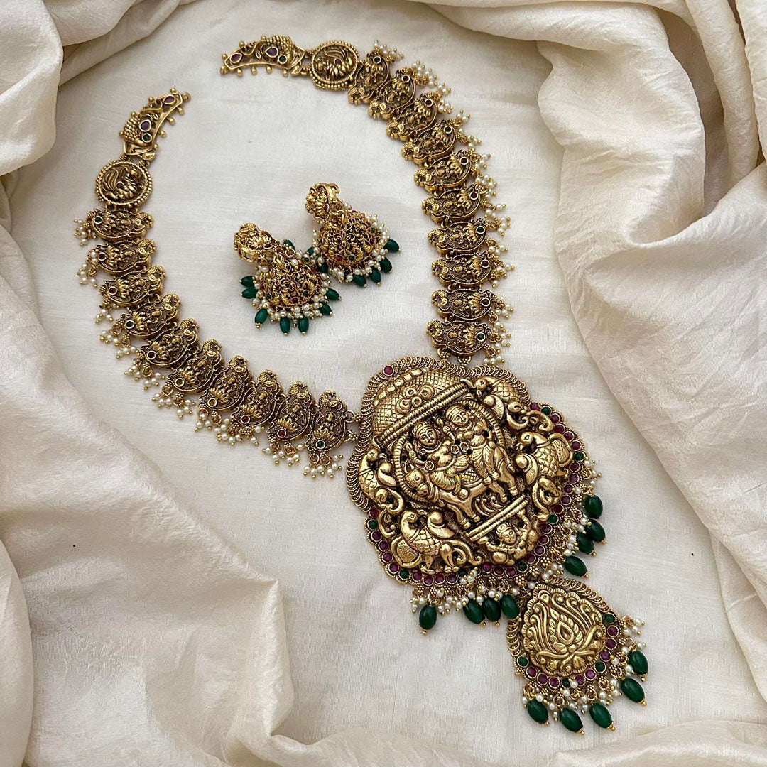 Premium Shiv Shakthi Temple Haram- Long Neckpiece is an Elegant a with double pendant nd Premium Quality Long neckpiece; comes with earrings. Green Bead Finish.