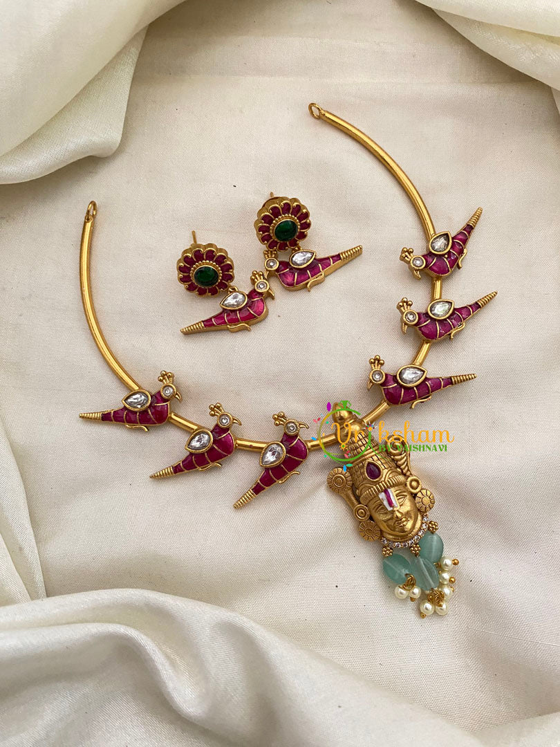 Premium Temple Hasli Choker-Vishnu pendant-Pastel Green Bead finish- premium quality AD Stone studded pendant hasli short neckpiece, comes with matching earrings.