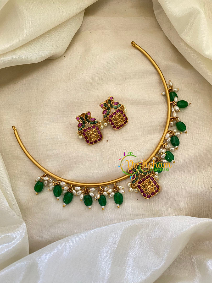 Premium Temple Hasli Choker-Lakshmi pendant -Green Bead - premium quality AD Stone studded pendant hasli short neckpiece, comes with matching earrings.