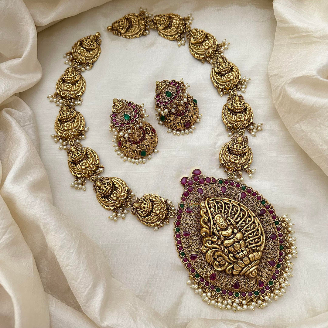 Premium temple Lakshmi Haram -Pearl-Red stones and Pearl Finish -shank Designed Temple Pendant Neckpiece; comes with matching ear hangings.