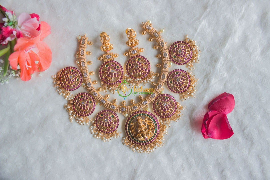 Premium Temple Lakshmi Neckpiece -Predominantly Red and then white and green stone studded neckpiece with cluster pearl Guttapusalu. Exquisite looking temple jewelery. Comes with pair of ear hangings.
