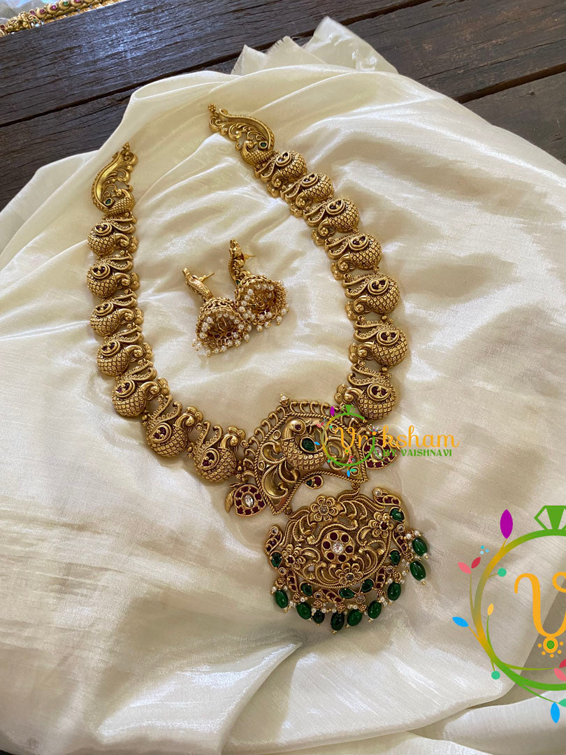 Premium Temple Peacock Haram - Green Bead Finish- Premium quality long neckpiece - Red White and Green stones, comes with similar matching ear hangings.