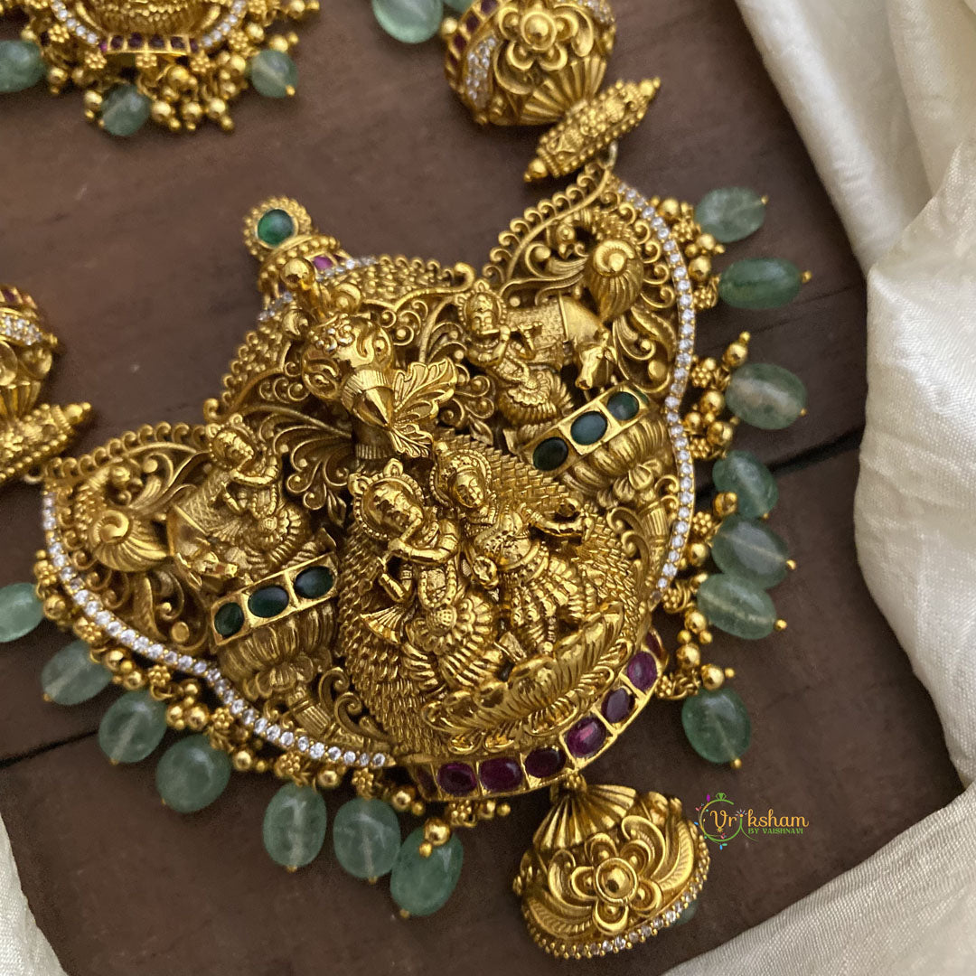 Elevate your style with our exquisitely crafted Premium Temple Pendant, featuring the graceful peacock, the divine Radha and Krishna, and a flute, all elegantly displayed alongside a cow. The aqua green beads bring a pop of color to this sophisticated and exclusive short necklace. Comes with matching earrings.