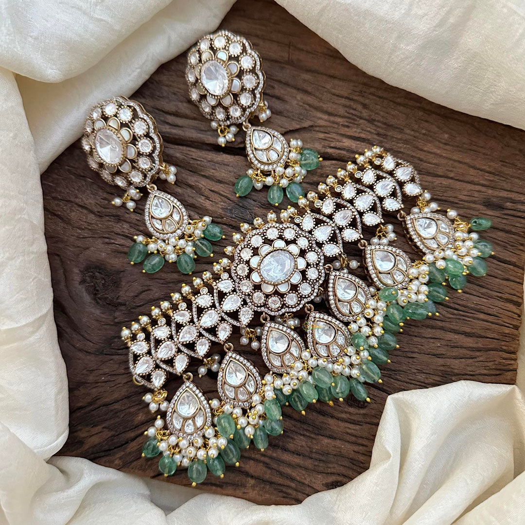 Make a statement with our Premium Victorian Diamond Choker. Featuring high-quality white diamonds, this choker is accented with vibrant aqua green beads and elegant pearls for a truly luxurious look. Perfect for any special occasion or adding a touch of glamour to your everyday style. Comes with matching earrings.