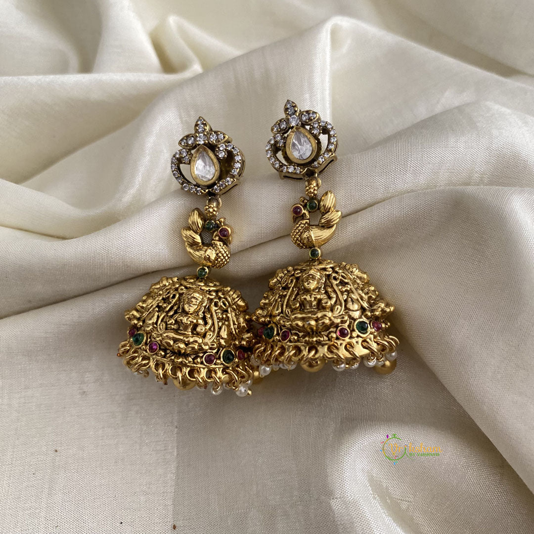 Premium Victorian Diamond Lakshmi Jhumkas-White, Golden-Pearl- The Premium Victorian Diamond Lakshmi Jhumkas in White, Golden, and Pearl embody elegance and tradition in every detail. Perfect for both formal occasions and everyday wear, these jhumkas evoke the grandeur of Victorian era temples, making them a statement piece for those who appreciate refined classic beauty.