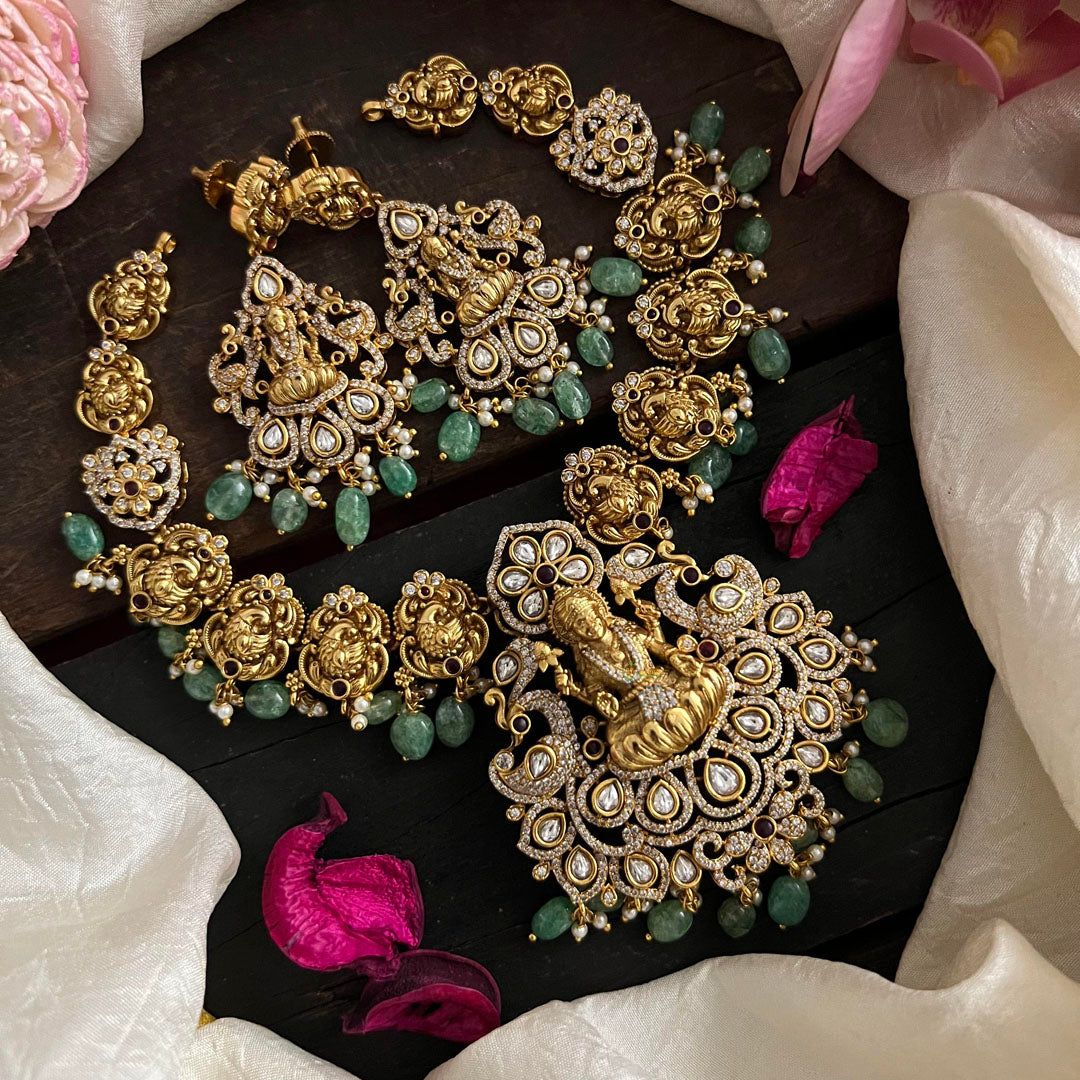 Elevate your style with our Premium Victorian Diamond Lakshmi Pendant Neckpiece. Made with aqua green beads and a stunning white diamond pendant, this short neckpiece is the perfect accessory for any outfit. With its premium gold look, you'll feel like a queen while wearing it. Comes with matching earrings.
