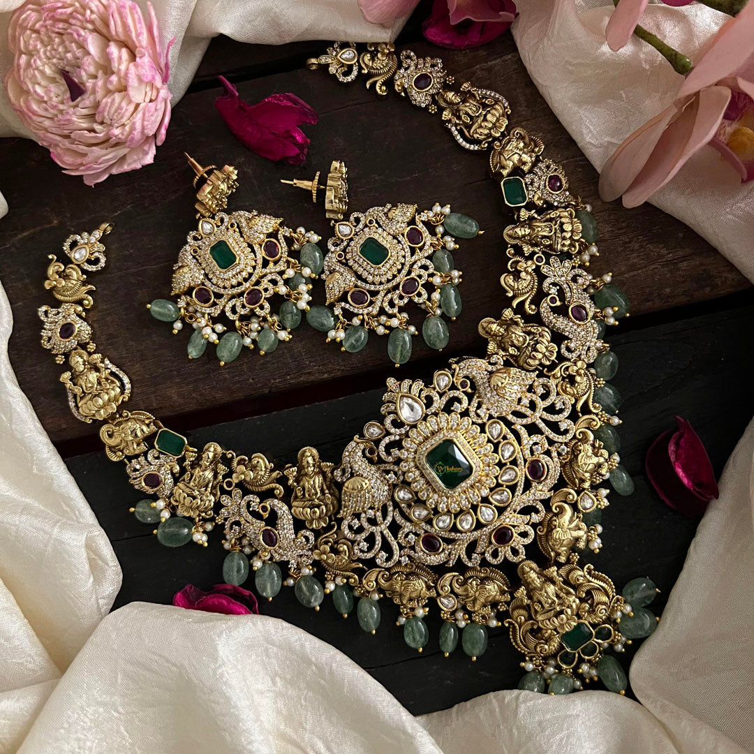 Elevate any outfit with our Premium Victorian Diamond Lakshmi Short Neckpiece. The striking combination of aqua green beads and pearls adds a touch of elegance and sophistication. Perfect for both casual and formal occasions, this neckpiece is a must-have for any fashion-forward individual. Comes with matching earrings.