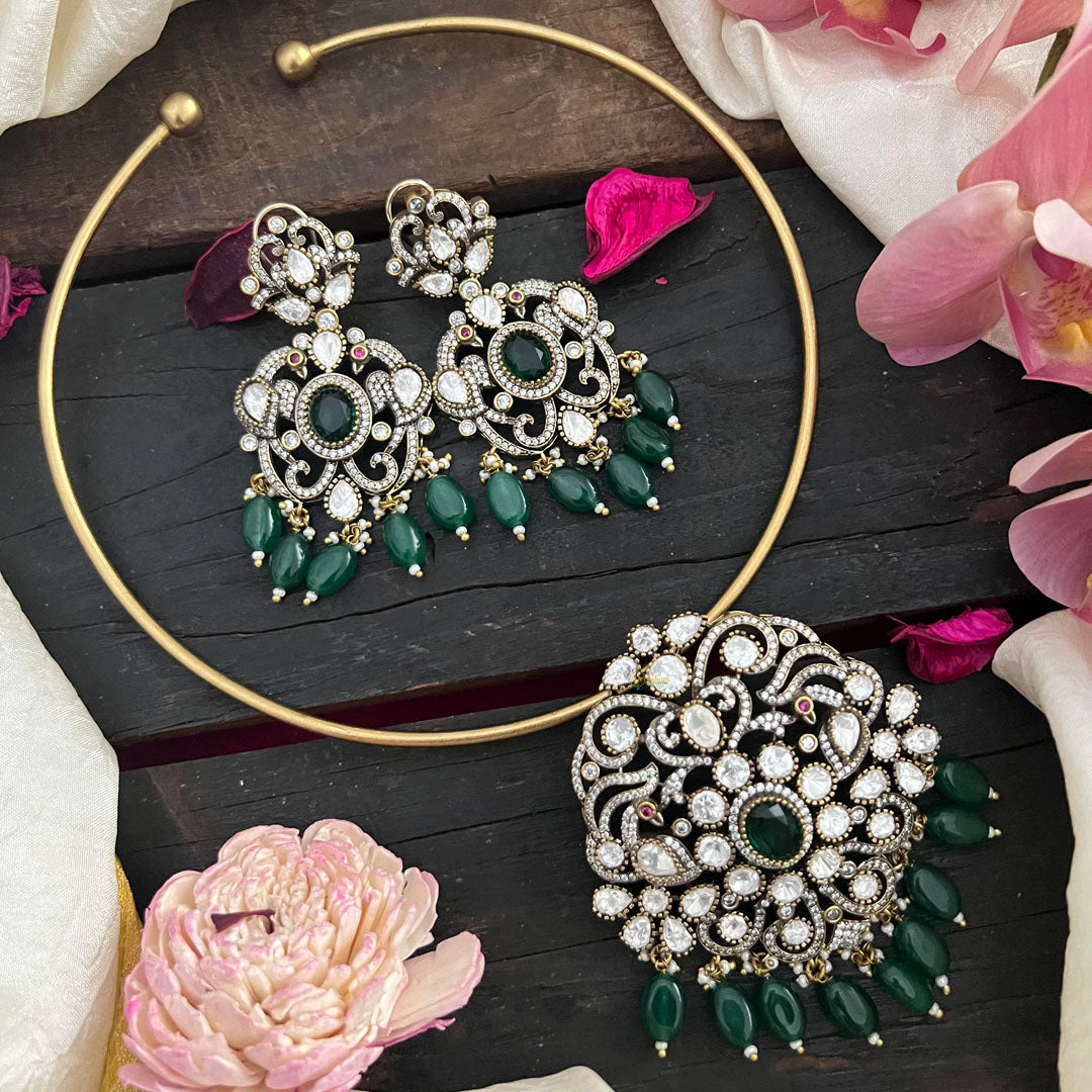 This stunning Premium Victorian Diamond Pendant Hasli in Green is the perfect accessory for any occasion. With its intricate design and sparkling diamonds, it is sure to add a touch of elegance to any outfit. Made with the finest materials, this pendant exudes luxury and sophistication. A must-have for any jewelry collection. Comes with matching earrings.