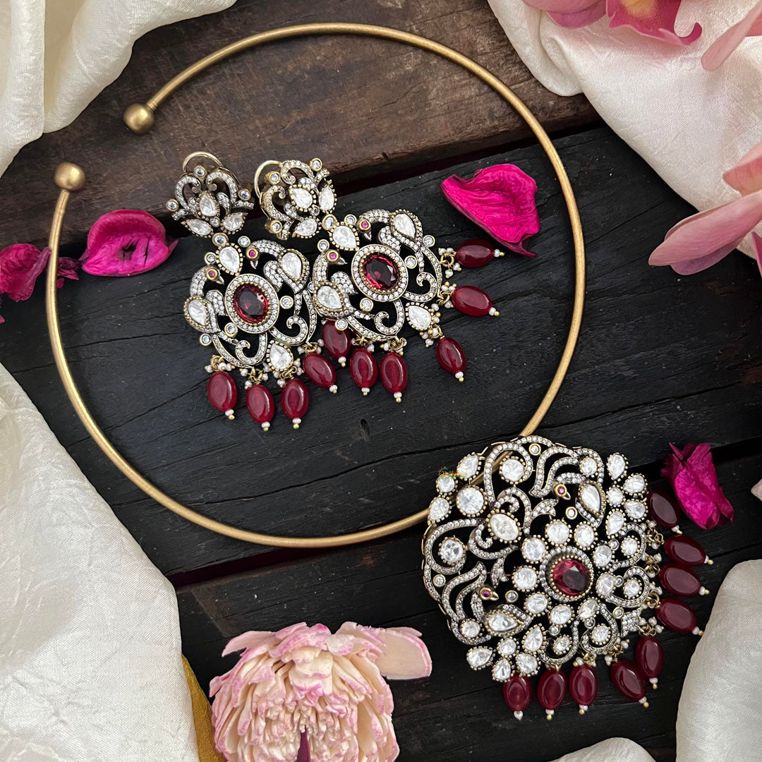 This stunning Premium Victorian Diamond Pendant Hasli in Red is the perfect accessory for any occasion. With its intricate design and sparkling diamonds, it is sure to add a touch of elegance to any outfit. Made with the finest materials, this pendant exudes luxury and sophistication. A must-have for any jewelry collection. Comes with matching earrings.