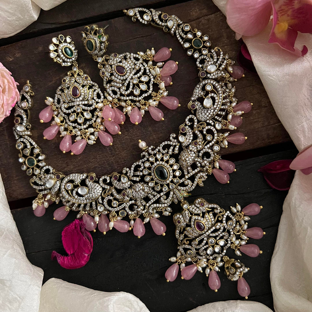 Add a touch of elegance to your outfit with our Premium Victorian Diamond Pendant Short Necklace. Made with beautiful pastel pink beads, this necklace is the perfect addition to any look. The diamond pendant adds a luxurious touch, making it a must-have for any fashionista. Comes with matching earrings.