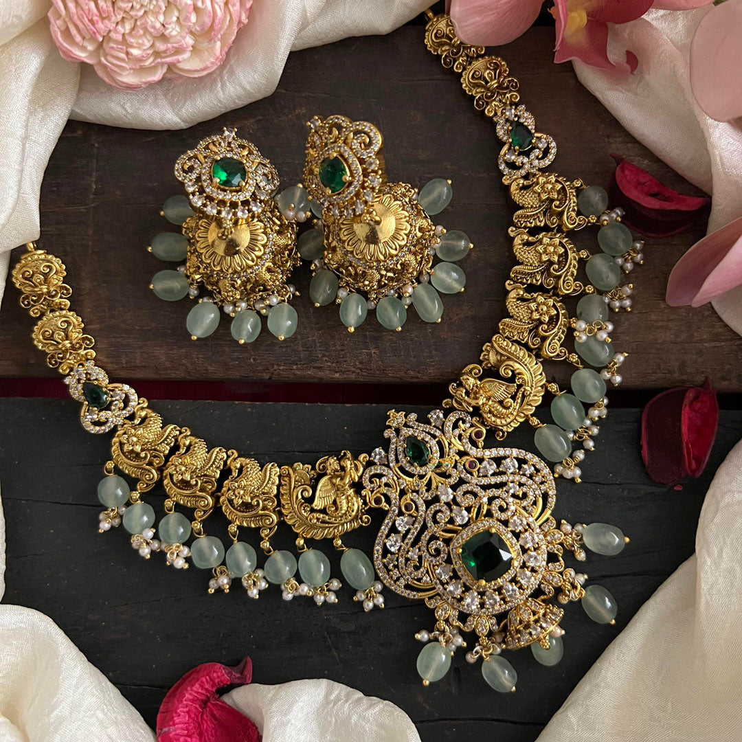 Elevate your outfit with our Premium Victorian Diamond Pendant Short Neckpiece! Designed with an elegant gold finish and adorned with aqua green beads, this necklace is the perfect finishing touch to any look. Add a touch of sophistication and style to your wardrobe with this stunning accessory. Comes with matching earrings.