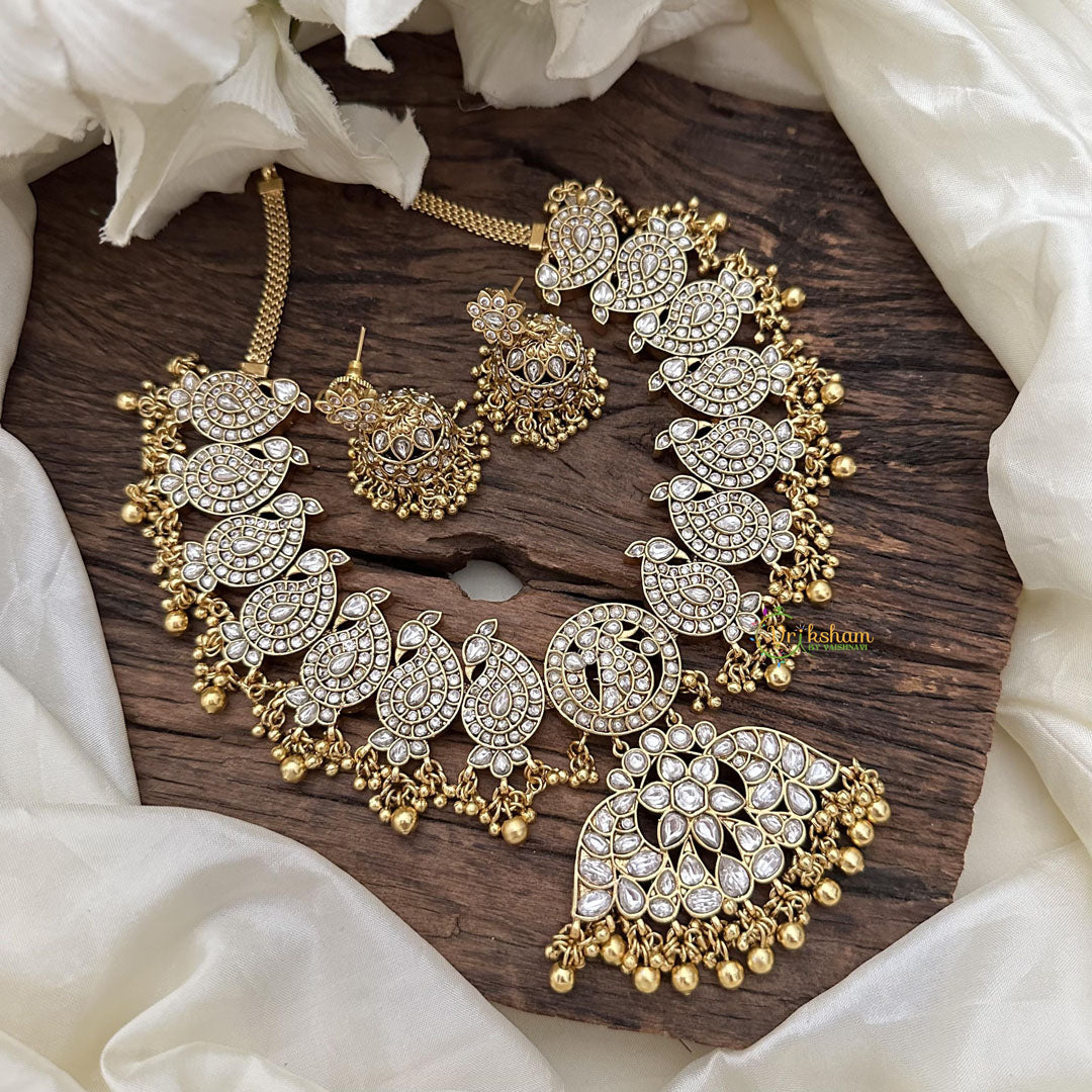 Indulge in luxury with our Premium White AD Stone Parrot Short Neckpiece. The exquisite design features handcrafted gold beads and sparkling white AD stones that add a touch of elegance to any outfit. Make a statement and elevate your style with this exclusive piece.