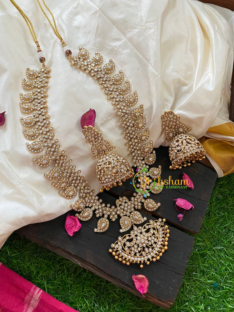 Premium White Stone Maanga Haram - Premium quality long neckpiece - Navarathna multicolor stone studded, comes with similar matching ear hangings.