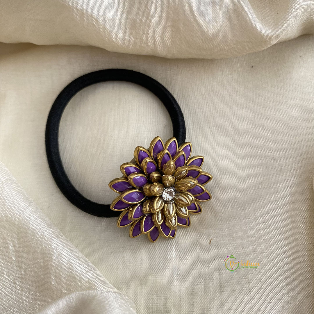 Purple, Golden Kundan Pendant Rubber Band - Flower - semi precious stone -Festive Wear Hair bands-premium gold like polish pendant.