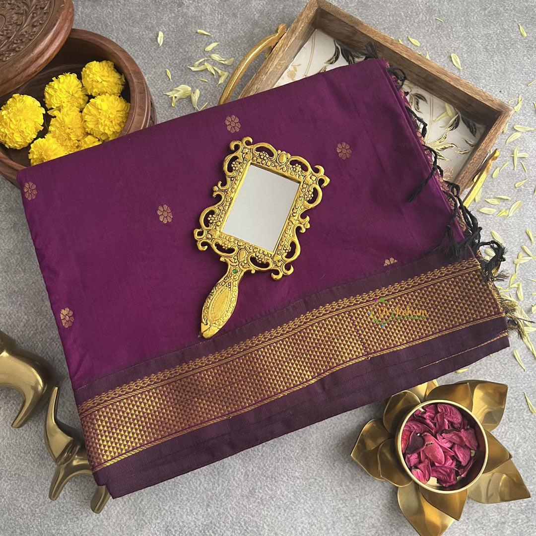 Purple With Double Golden Border - Kalyani Cotton Saree - These sarees are highly comfort, versatility, and timeless appeal, making them a popular choice for both casual and formal occasions. Whether worn during festive celebrations, weddings, or everyday wear, Kalyani Cotton Sarees exude grace and sophistication, embodying the essence of Indian tradition and craftsmanship - comes with Blouse attached. Contrast border saree. Poly mix cotton.