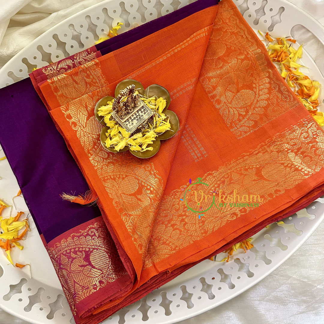 Purple with Orange Silk Cotton Saree - Plain Festive wear saree ; comes with Blouse attached. Two side contrast border and pallu. One side bigger border than the other.