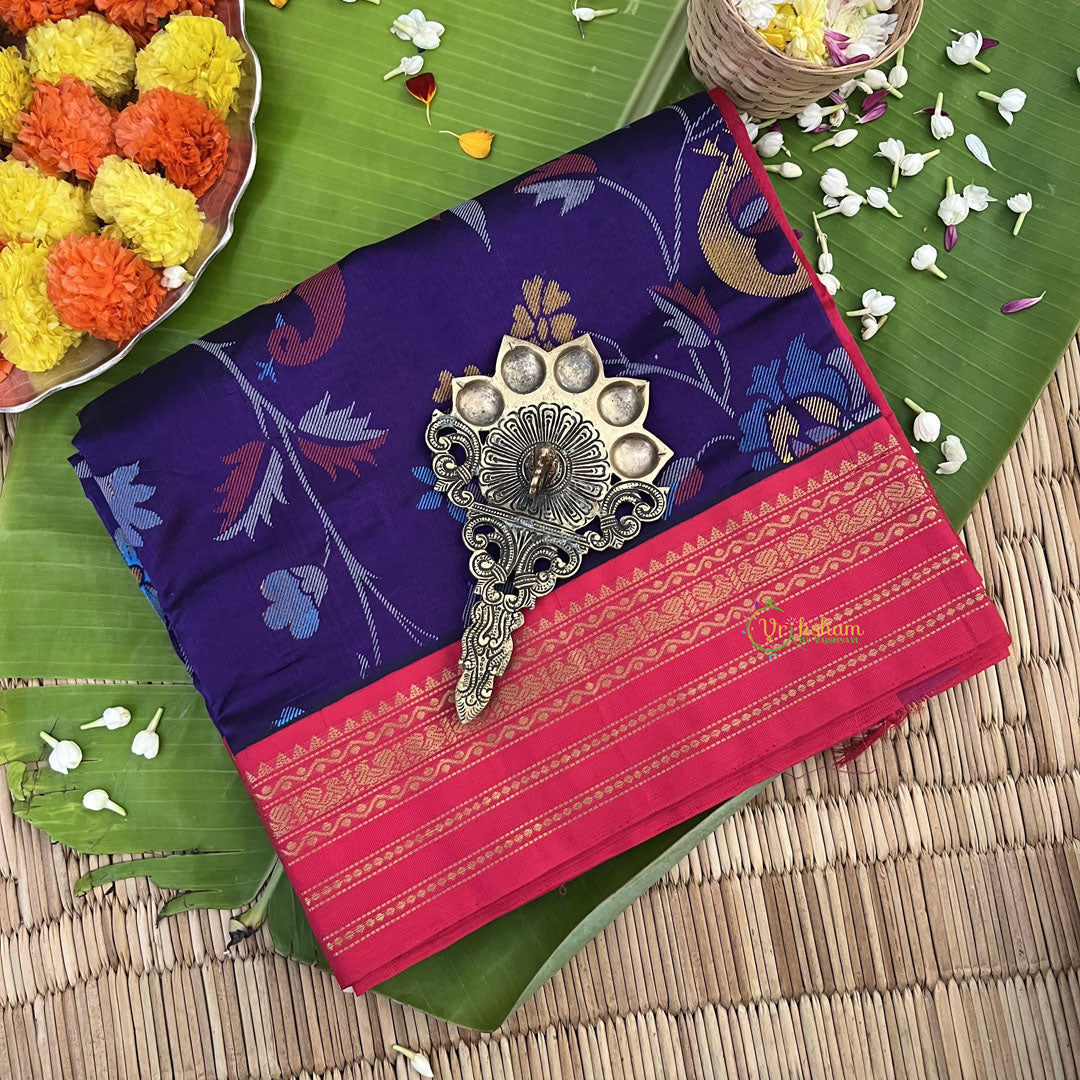 Elevate your wardrobe with this stunning Purple with Red Border Silk Cotton Kalamkari Saree. Made from luxurious silk cotton, this saree features a beautiful kalamkari design and a vibrant purple color with a contrasting red border. Make a statement at any event with this exclusive and sophisticated saree.