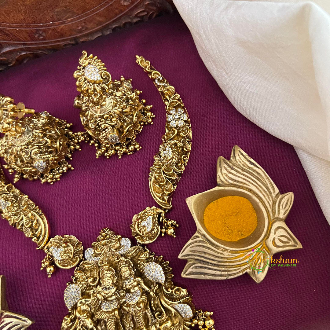 Celebrate divine love with this enchanting Radha Krishna AD Stone Pendant Hasli Necklace. Featuring an exquisite Radha Krishna motif adorned with sparkling AD stones, this traditional hasli design symbolizes eternal devotion and spiritual connection. The intricate craftsmanship showcases authentic temple jewelry aesthetics with a perfect blend of cultural heritage and contemporary elegance.