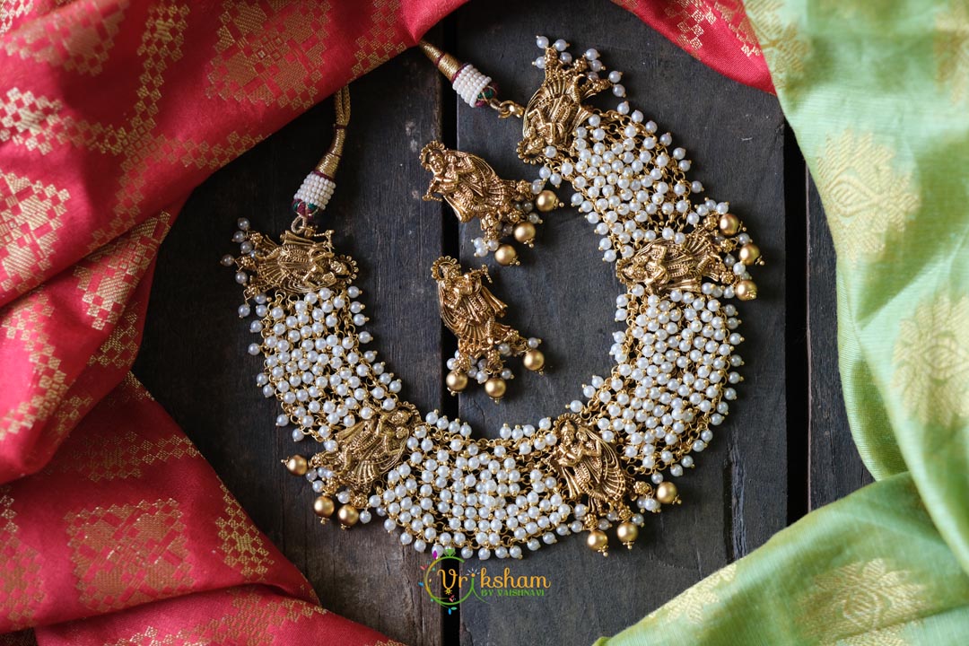 Gold look alike finish pearl neckpiece with Radha and Krishna. Comes with earrings