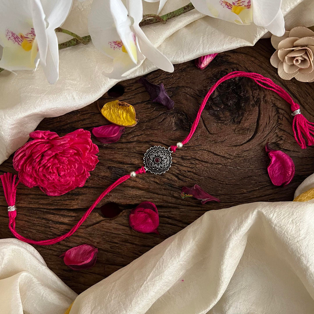 Enhance the bond of love with our Rakhi pendant. Made of pure silver, this elegant pink Rakhi pendant will add a touch of charm to your brother's wrist on this special occasion of Rakshabandhan. Show your love and gratitude with this unique and meaningful gift.