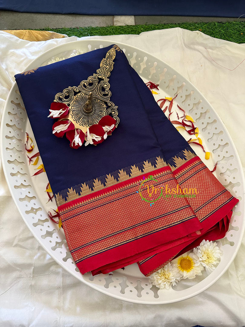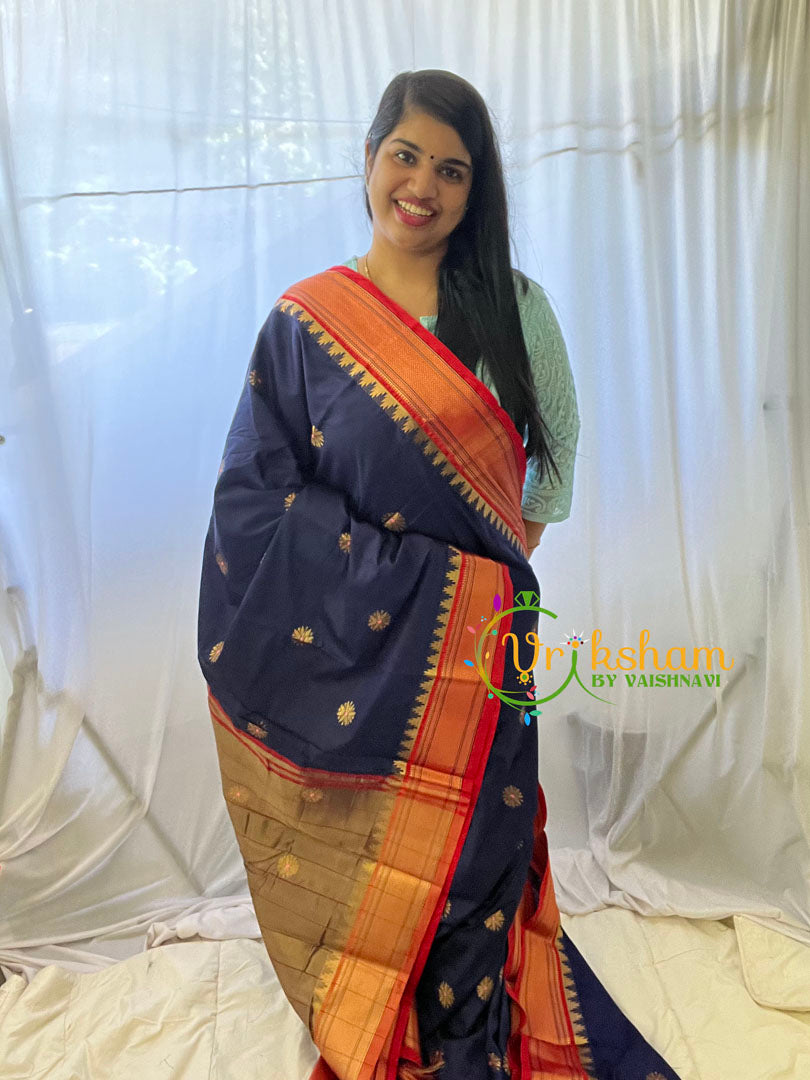 Dark Blue with Red Rani Paithani Soft Silk Saree – Festive wear saree –Paithani Butta work throughout the saree; comes with Blouse attached. Thread work two side traditional border.