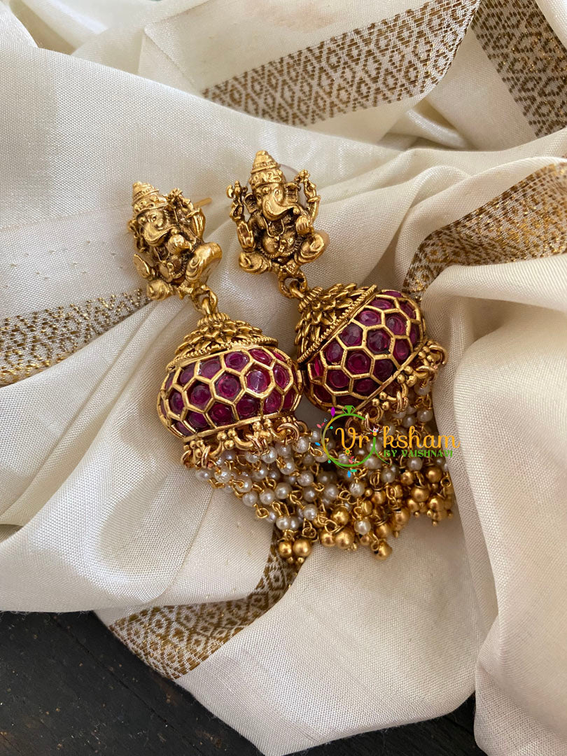 Red AD Stone Ganesh Jhumkas- is gold look alike earrings. This earrings is having a ganesh stud kudai jhumka with stone embedded which also has a pearl embellishments at the bottom.