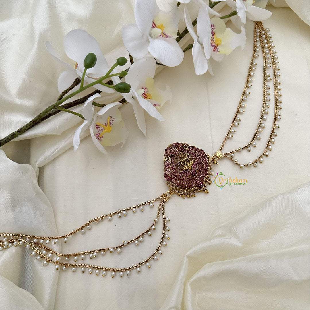 Indulge in the opulence and grace of our Red AD Stone Lakshmi Jada Billai adorned with a delicate Pearl Maatil. The intricate design and vibrant red stones symbolize prosperity and luck, making it a must-have for any luxurious occasion. Elevate your style and embrace the artistry of this exclusive piece.