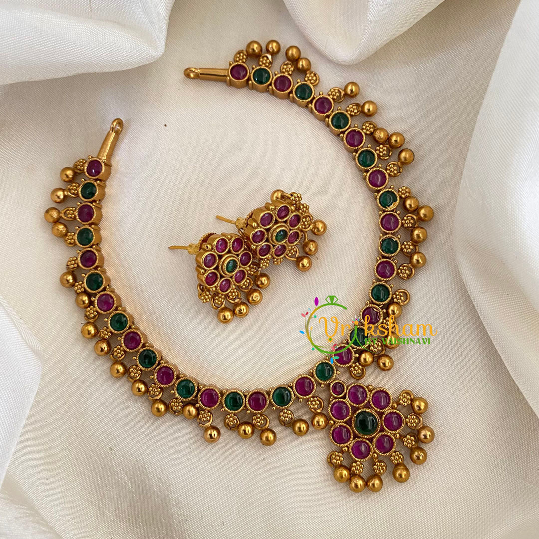Red Green AD Stone Addigai Short Neckpiece- Single Pendant Short neckpiece with gold bead finish; comes with matching earrings.