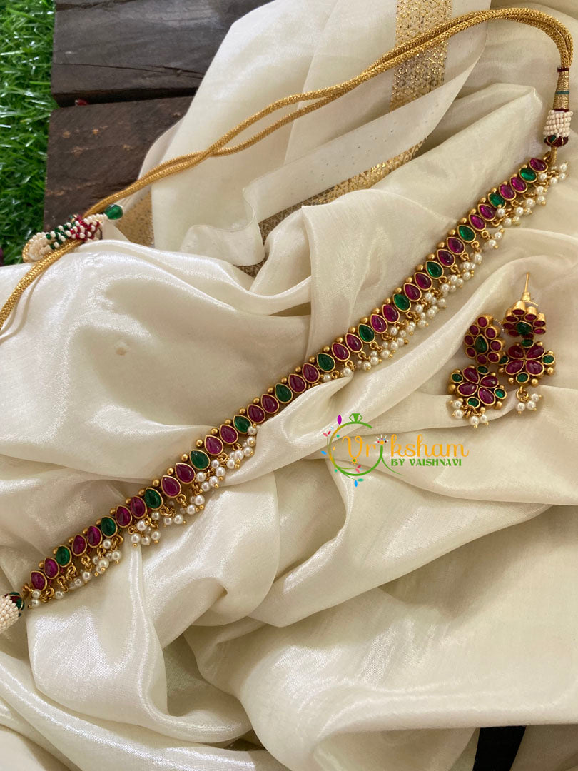 Red Green AD Stone Choker -Thilak shaped red green AD stone choker with flower earrings. Cluster Pearl Finish.