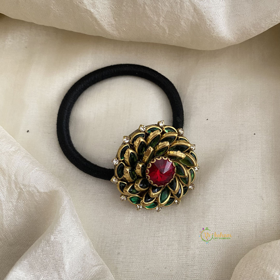 Red, Green Kundan Pendant Rubber Band - Flower - semi precious stone -Festive Wear Hair bands-premium gold like polish pendant.